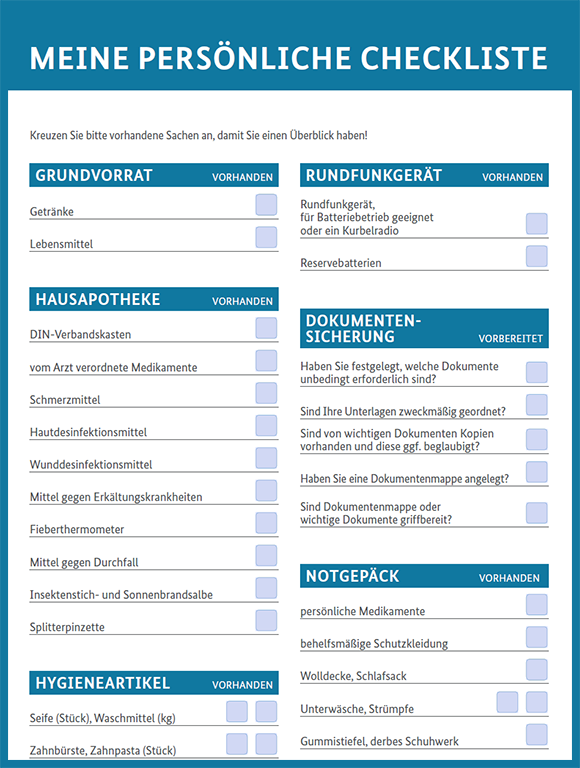 Bei der folgenden Beschreibung habe ich mich an dem Ratgeber für Notfallvorsorge und richtiges Handeln in Notsituationen vom Bundesamt für Bevölkerungsschutz und Katastrophenhilfe gehalten. Ich verlinke euch unten auch nochmal die Checkliste.